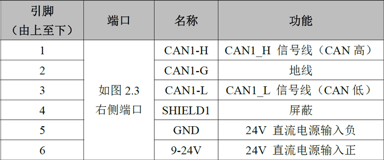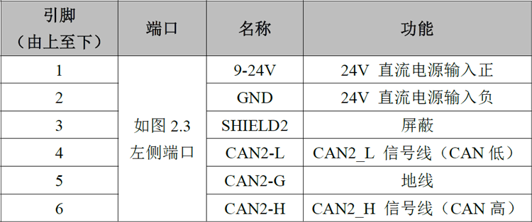 表2.1 GCAN-216模块的左侧接口定义