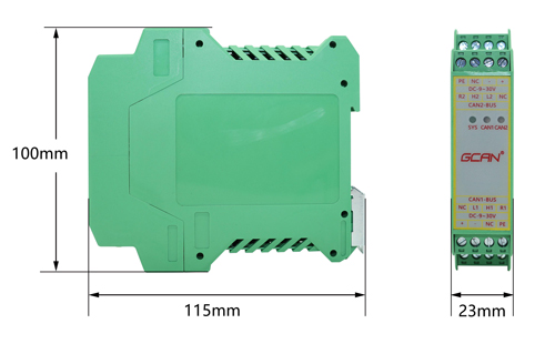 设备外形尺寸:(长,含接线端子)115mm*(宽)23mm*(高)100mm,其示意图如图所示。