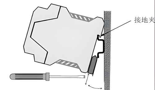 GCAN-226模块安装方法如图所示,可使用一字螺丝刀辅助将模块安装到DIN导轨上。