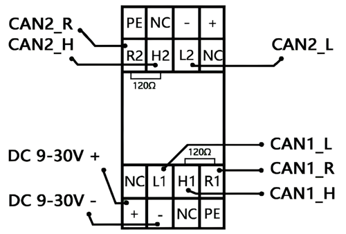 GCAN-226模块集成2路DC 9-30V电源接口、2路标准CAN总线接口,CAN总线自带120Ω终端电阻,可通过连线接入。GCAN-226模块接线端子如图所示。
