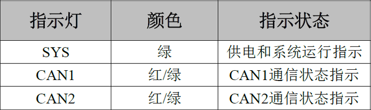 GCAN-226系列模块具有1个PWR指示灯用来情况,1个SYS指示灯用来指示系统供电和系统的运行状态,2个CAN指示灯用来指示CAN总线数据传输。这3个指示灯的具体指示功能见下表,这3个指示灯处于各种状态的含义如表所示。