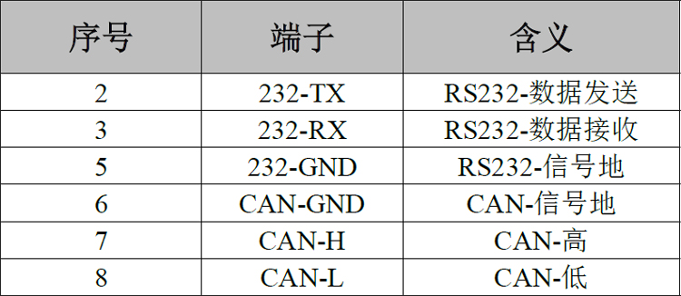 RS232、CAN接口的DB9接口,引脚定义如下图及下表(注:未写入表中的引脚均为NC)。