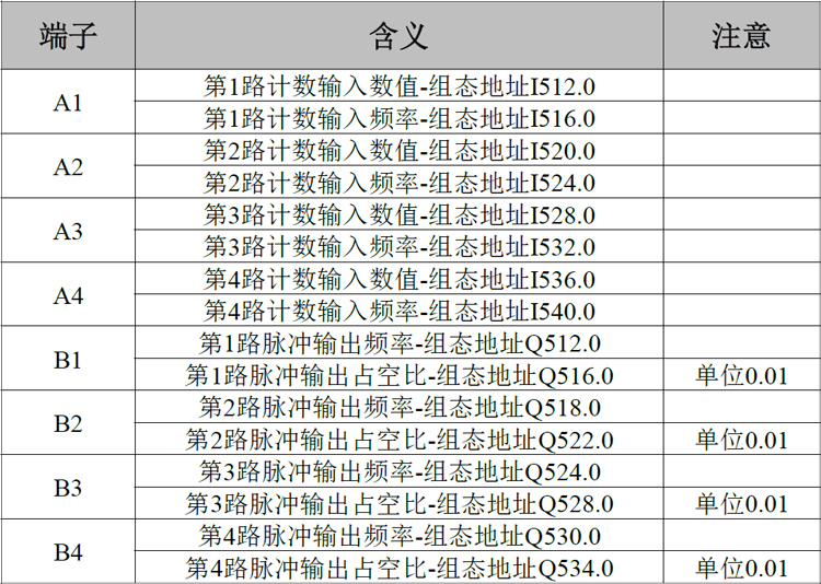 当A1~A4作为高速计数输入使用,B1~B4作为高速脉冲输出使用时。OpenPCS的高速输入输出组态定义见表2.5。