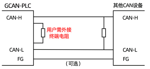 请注意:GCAN-PLC-301/302的CAN总线内部未集成120Ω终端电阻。如果节点数目大于2,中间节点不需要安装120Ω的终端电阻。需要使用时,将电阻两端分别接入CAN_H、CAN_L即可,如图3.2所示。