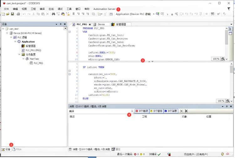 GCAN-PLC-301/302可使用OpenPCS软件对其编程,也可使用CodesysV3.5 SP16及以上版本软件对其编程。软件支持符合IEC-61131-3标准中规定的五种标准编程语言,这使得程序的可移植性和复用性很强,而且软件还具有多种调试功能(断点、单步等),调试程序更加方便。