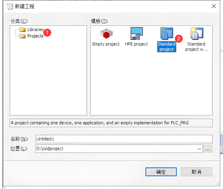 菜单工具栏-> 文件-> 新建工程, 创建Standard project , 设备选择“GCAN-PLC-M”,如下图所示。