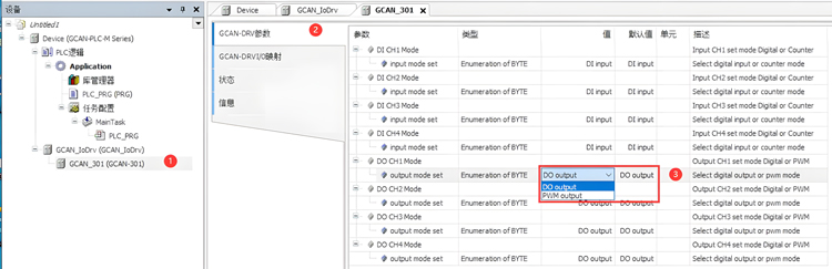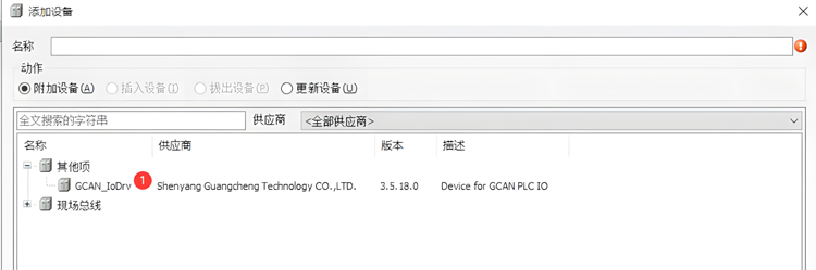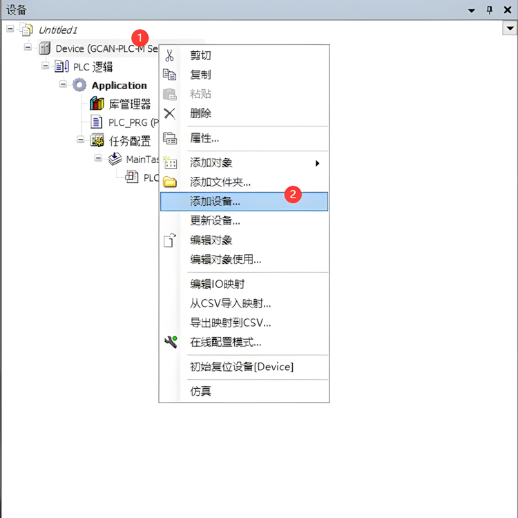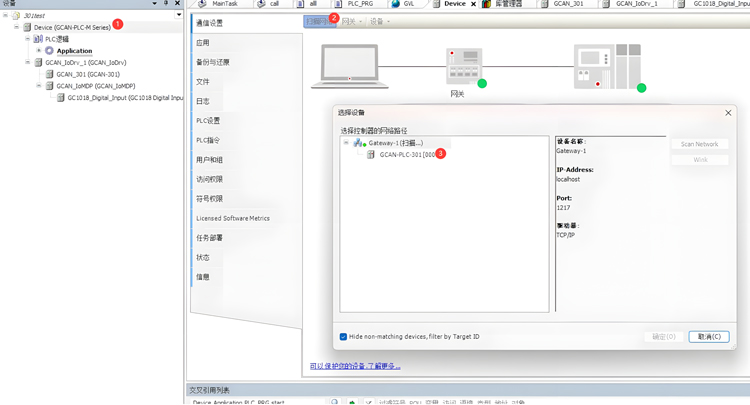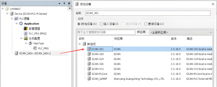 设备/ POU 窗口->Device 右键->添加设备,选择GCAN_IoDrv;GCAN_IoDrv 右键->添加设备,选择GCAN-301。