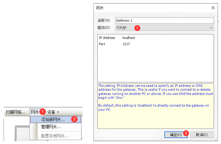 网关->添加新网关,驱动选TCP/IP,点击“确定”按钮;