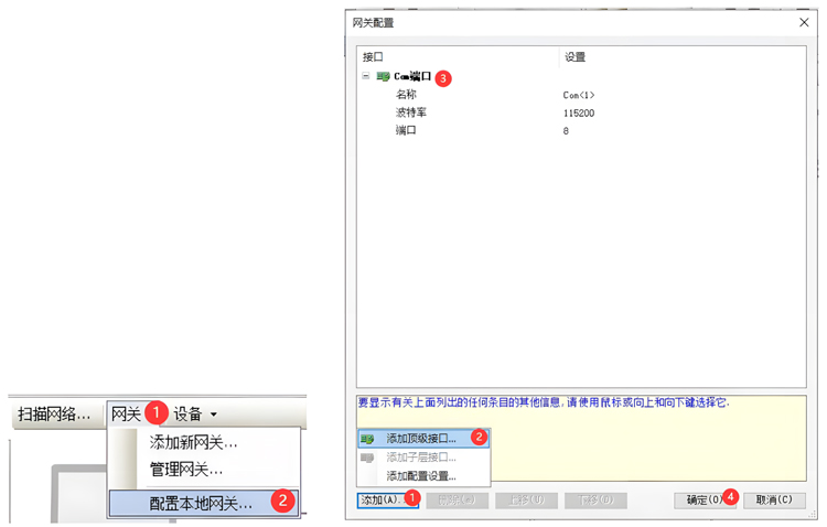 网关->配置本地网关,添加顶级接口,选择USB-Enhanced-SERIAL-A 对应的Com 端口,波特率选择115200,点击“确定”按钮。