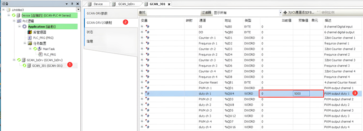 GCAN_301(GCAN-301)->GCAN-DRVI/O 映射,请注意占空比单位为0.01,即设置5000 时为占空比50%。