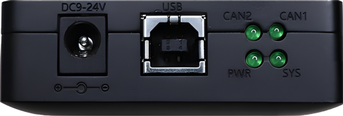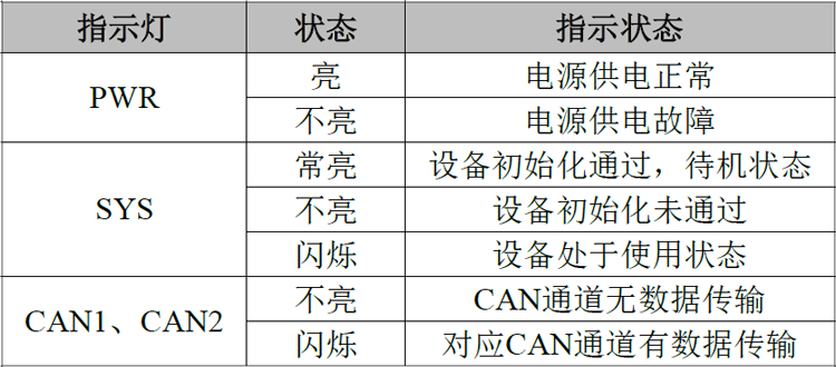 USBCAN-II C+接口卡上电后,PWR点亮,同时系统初始化状态指示灯SYS点亮,表明设备已经供电,系统正在初始化;否则,表示存在系统电源故障或系统发生有严重的错误。