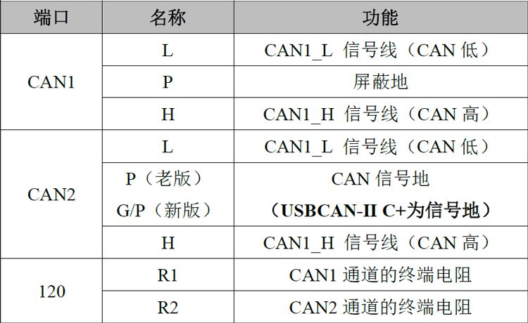 表2.2 USBCAN-II C+接口卡的CAN-bus 信号分配