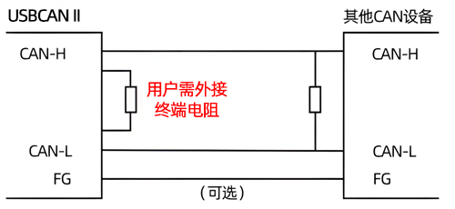 USBCAN-II C+接入CAN总线时只需将CAN_H连CAN_H,CAN_L连CAN_L即可建立通信。