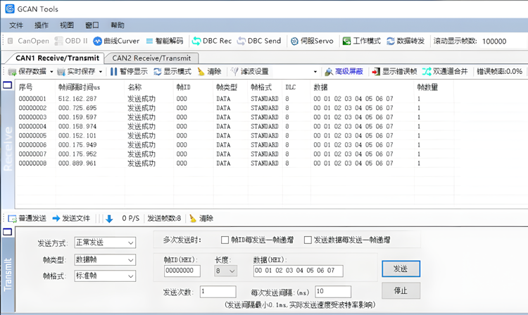 接收和发送界面是GCANTools的主要功能,在此界面,用户可以直观的看到接收到的CAN报文,以及通过普通发送或列表发送的方式,向总线上发送数据。