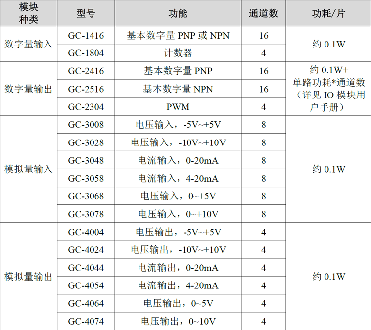 GC 系列可编程控制器扩展模块目前包括:数字量输入扩展模块、数字量输出扩展模块、模拟量输入扩展模块、模拟量输出扩展模块四大类,具体的选型表如下表所示。