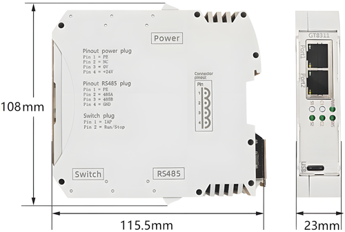 GCAN-GT-8311-MRTUM模块集成1路24V DC电源接口、2个标准Profinet接口、1个标准以太网接口、1路标准RS485接口,GCAN-GT-8311-MRTUM模块接线端子如图所示。