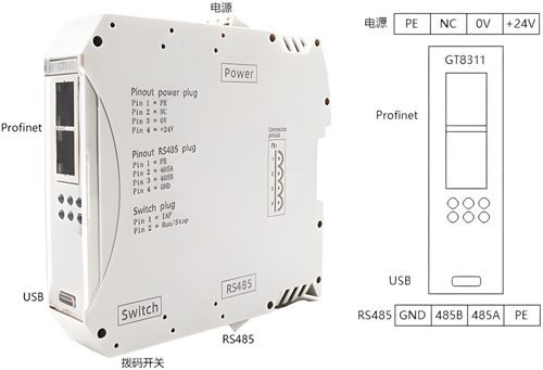 GCAN-GT-8311-MRTUS模块集成1路24V DC电源接口、2个标准Profinet接口、1个标准以太网接口、1路标准RS485接口,GCAN-GT-8311-MRTUS模块接线端子如图所示。