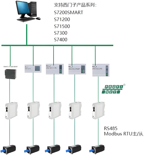 西门子PLC的Profinet接口连接8311的Profinet接口,8311的RS485接口连接Modbus RTU从站的RS485接口。