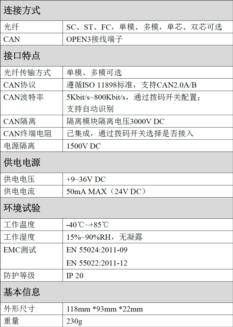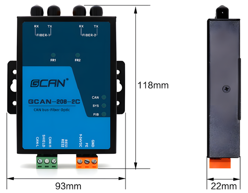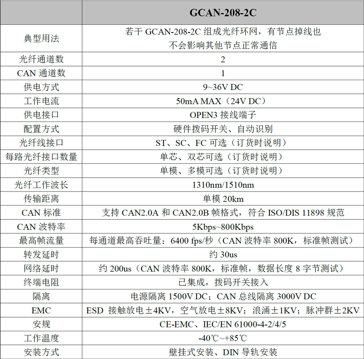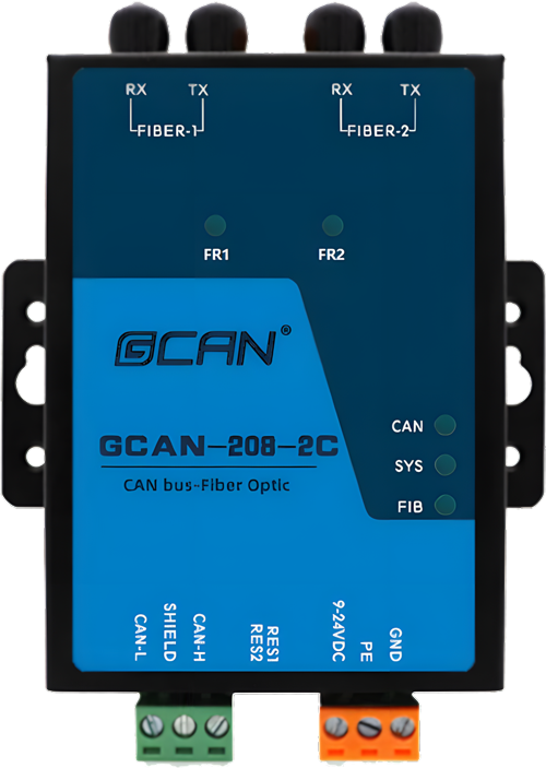 GCAN-208-2C模块集成一路9-36V DC电源接口、1路标准CAN总线接口及2路标准光纤接口(单模、多模,SC、ST、FC可选)。