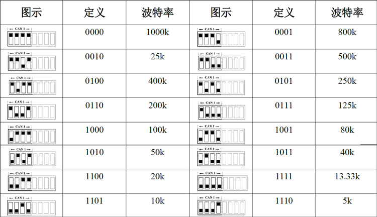 (5)CAN总线通讯波特率在5Kbps~800Kbps之间可通过拨码开关配置;