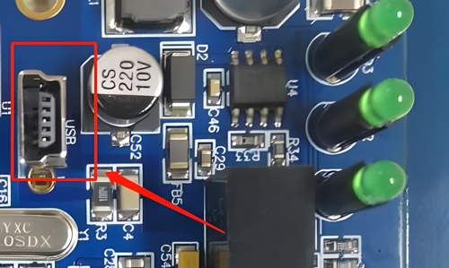 当需知道当前设备使用的波特率的值时,先打开设备外壳(拧开两侧黑色螺丝即可)然后用USB线将设备的USB口和电脑连接上,USB口为USB-MINI口,如图3.3所示。