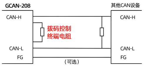 GCAN-208-2C系列模块CAN通道内部均已经集成标准120Ω终端电阻,可通过CAN总线接线端子之间的拨码开关选择是否接入。