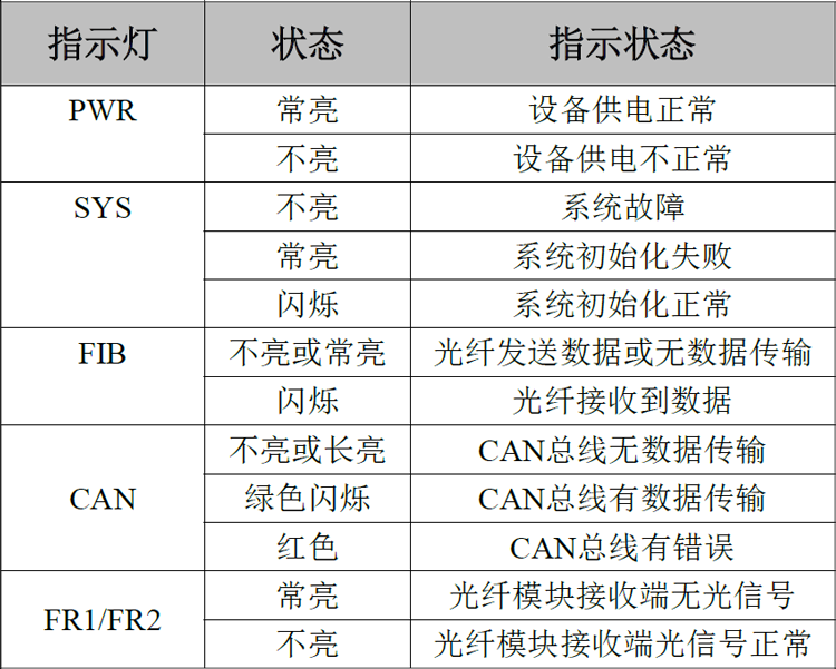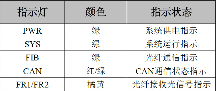 GCAN-208-2C系列模块具有1个PWR指示灯用来指示系统供电情况,1个SYS指示灯用来指示设备的运行状态,1个FIB指示灯用来指示光纤数据传输,2个FR指示灯用来指示光纤模块接收光信号状态,1个CAN指示灯用来指示CAN总线数据传输。这5个指示灯的具体指示功能见表3.3,这5个指示灯处于各种状态的含义如表3.4所示。