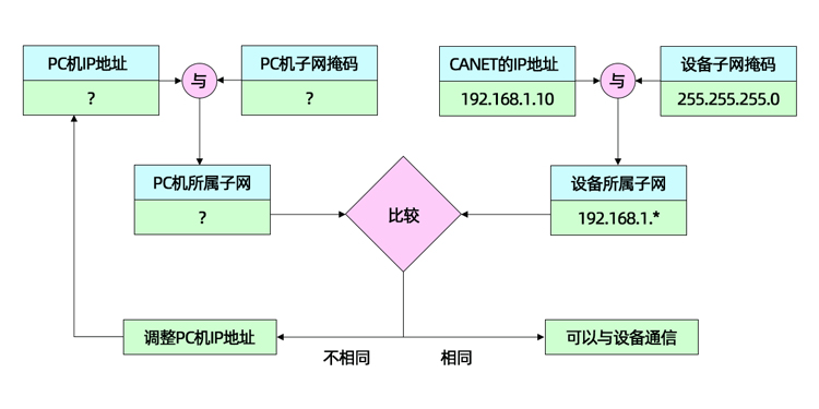 GCAN-205C模块在出厂时设定了一个默认的IP地址(192.168.1.10)和网络掩码(255.255.255.0),用户可以按图3.2所示的流程检查该设备是否和用户PC机在同一网段。