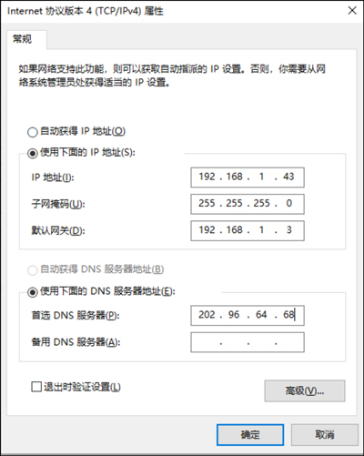 进入操作系统后,进入本机的控制面板→进入“网络连接”(WinXP)或“网络和共享中心”(Win7、8、10)→进入“本地连接”属性→“Internet协议(TCP/IP)”(winXP)或“Internet协议版本4(TCP/IP)”(Win7)属性,出现如图3.3所示界面。