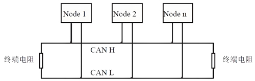 CAN总线网络采用直线拓扑结构,总线最远的2个终端需要安装120Ω的终端电阻;如果节点数目大于2,则中间节点不需要安装120Ω的终端电阻。对于分支连接,其长度不应超过3米。CAN总线的连接见图3.4所示。