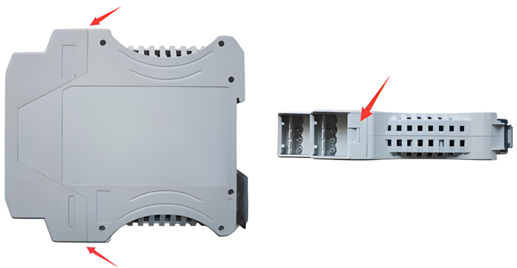 GCAN-205C模块安装方法如图2.2所示,可使用一字螺丝刀辅助将模块安装到DIN导轨上。