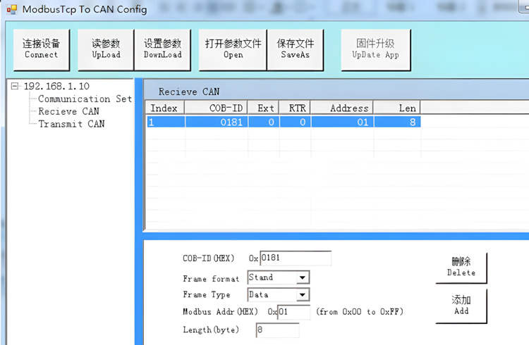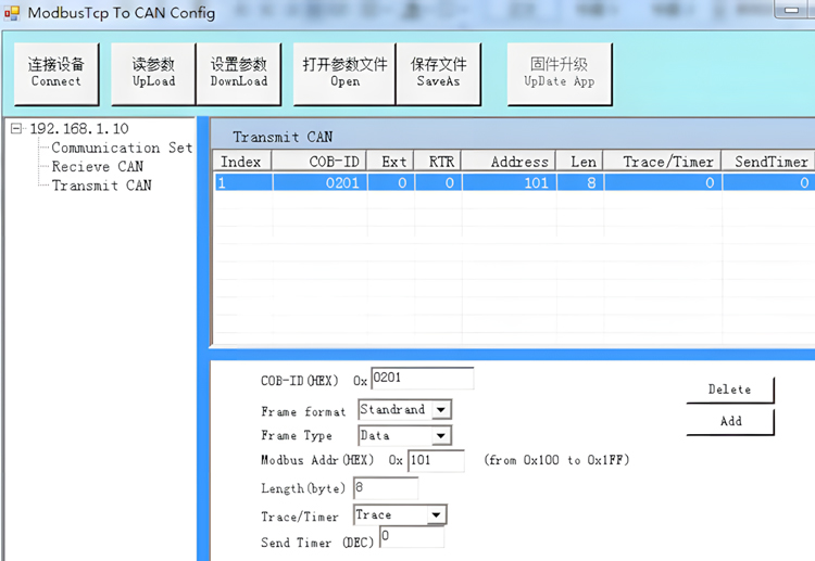 COB-ID为CAN总线的帧ID设置,Frame Format为帧格式(标准帧Standard/扩展帧Extended)设置,Frame Type为帧类型(数据帧Data/远程帧RTR)设置,Modbus Address为Modbus端寄存器首地址设置,Length为CAN帧数据的长度,最大值为8。请注意:这个长度是1个字节单位,而Modbus地址是整型(2个字节),因此如果CAN数据长度是8个字节,那么对应Modbus地址映射为4个字节。