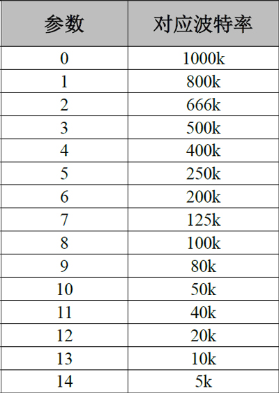 “CAN Baudrate”可设置CAN总线的波特率,需按表填写,对应表如下4.1:
